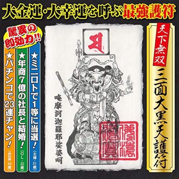 三面大黒天の護符で大富豪運を掴み取る。金運財運勝負運に宝くじ運まで爆上がりを狙う強力な御守り。はがきサイズの霊威が日常を激変させる。戦国武将も愛した最強の守護神が、あなたの運命を切り拓き至高の繁栄を授ける。