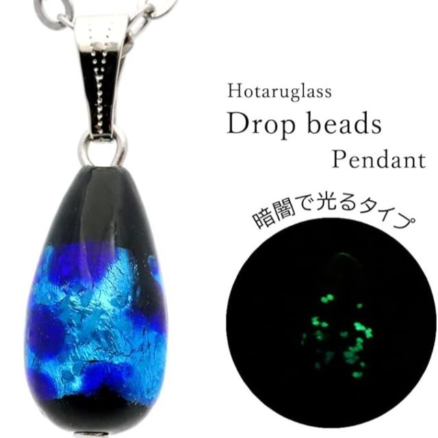 沖縄の碧い海を雫に閉じ込めた光るホタルガラス。GOLD STONEのしずく型ペンダントは蓄光タイプで暗闇でも美しく輝く。琉球の伝統を感じるドロップとんぼ玉のネックレスが、日常に幻想的な彩りと癒やしを添える。