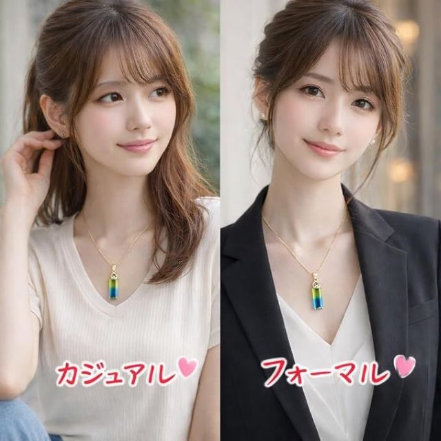 このネックレスの最大の魅力は、なんといってもその神秘的なグラデーションにあります。角度を変えるたびに、深みのある色彩が滑らかに変化し、まるで生きているかのように複雑な表情を見せてくれます。その姿は、北極の空を彩るオーロラや、夕暮れ時の淡い空の色を閉じ込めたかのよう。実際に身につけてみると、胸元で揺れるたびに光を捉えて煌めき、肌の色を明るく、そしてどこか儚げで上品な印象へと導いてくれます。この唯一無二の輝きは、周囲の視線を惹きつけずにはいられません。