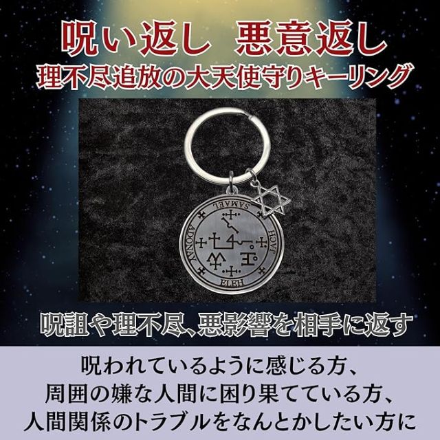 月幸堂の呪い返しと悪意返しの大天使守りは理不尽な攻撃を相手に返す開運加護の魔術護符でステンレスキーリング仕様のキーホルダーは呪詛から身を守り強力な守護と浄化をもたらすお守りとして絶大な信頼を誇る一品
