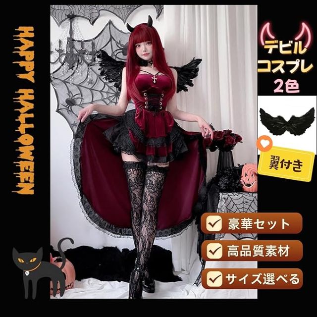 【降臨!小悪魔セクシーデビル】史上最強に可愛い魔女コスプレ6点フルセット!羽・パニエ・ニーハイ付きで即変身!ハロウィン仮装やイベントで視線独り占め!黒×赤の誘惑で「可愛い」も「セクシー」も叶える大人レディースの最強武器!
