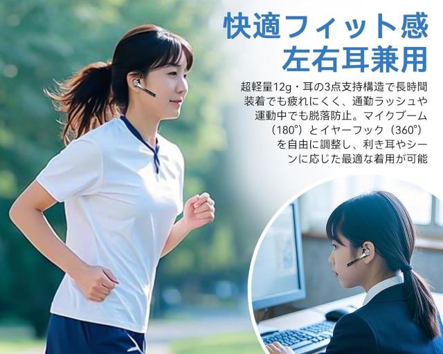 - 左右耳兼用&メガネ併用: イヤーフックは広範囲な調節が可能で、左右どちらの耳にも柔軟にフィット。さらに、人間工学に基づいた設計により、メガネをかけた状態でも耳が痛くなりにくい快適な装着感を実現しています。