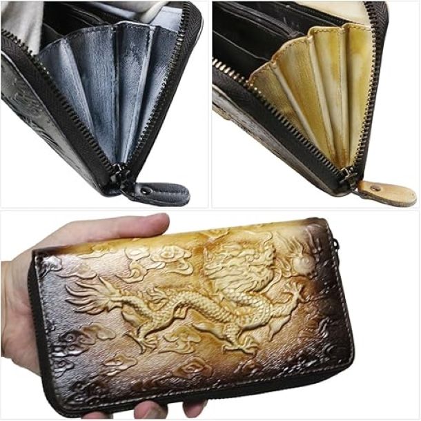 この財布の最大の特徴は、なんといっても中央に鎮座する五本爪の龍です。中国の歴史において五本爪の龍は、皇帝のみが使用を許された至高の象徴でした。四方を司る聖獣の中でも、東方を守護する青龍は「成功」と「発展」を司ると言われています。手に取った瞬間、その精巧な立体感から放たれる力強いエネルギーに、背筋が伸びるような感覚を覚えるはずです。