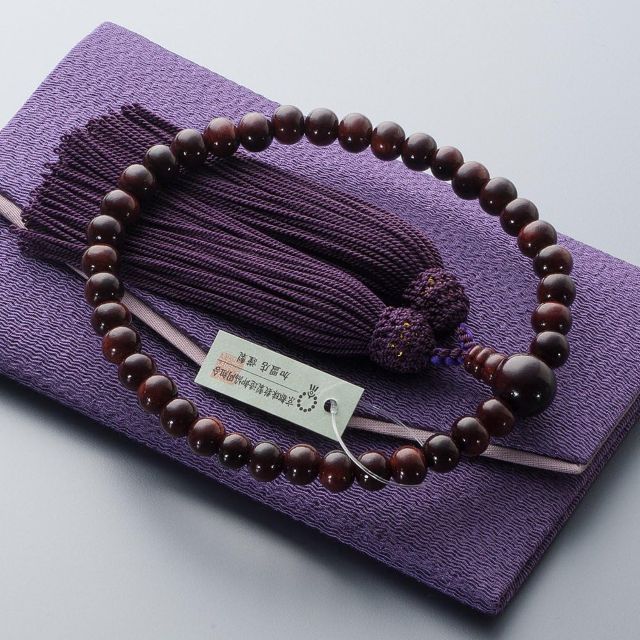 仏壇屋 滝田商店の本格京念珠、紫檀で心安らぐ祈りの時間を。 すべての宗派で使える女性用数珠。 上質な正絹房と数珠袋付きで、大切な故人への想いを込める。