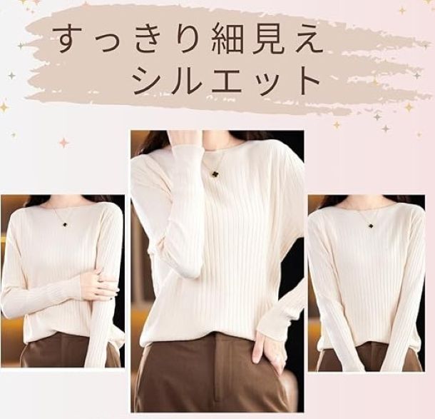 デザイン面では、ボートネックが大きなポイントです。鎖骨がきれいに見える横長のネックラインは、首元をすっきりと見せ、女性らしい上品で洗練された印象を与えます。また、全体のリブ編みが縦のラインを強調し、着痩せ効果と同時に、ボディラインを美しく見せてくれるスタイルアップ効果も期待できます。
