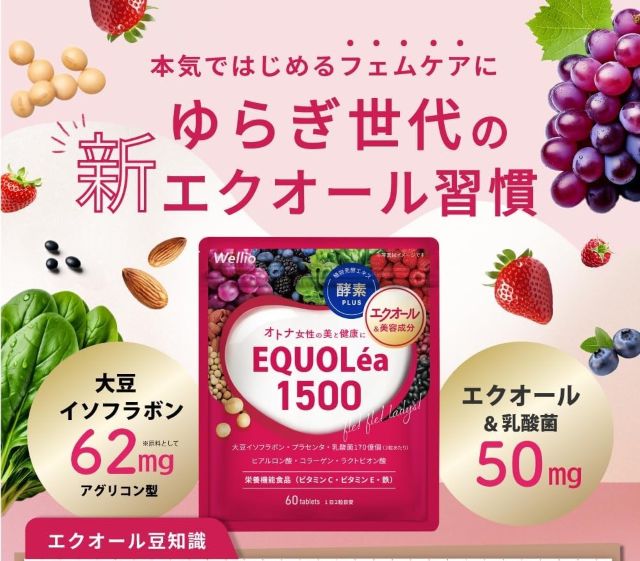 吸収率二百パーセント以上を実現したエクオレア1500。大豆イソフラボン六十二ミリグラムの高配合サプリ。エクオールと乳酸菌の力で女性のゆらぎを整える。コラーゲンやプラセンタも加えた美容と健康のオールインワン。
