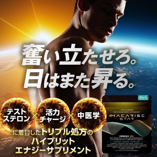 マカライズスターが導く溢れる活力と理想の自分。マカ6000mgにヒトデエキスと亜鉛を凝縮した栄養機能食品。シトルリンやすっぽんが夜の自信と漲るパワーを支える。限界を突破する男性のための至高のサプリメント。