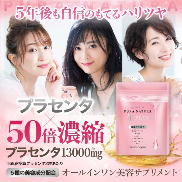 プラセンタ50倍濃縮が叶える極上の輝き。1日13000mgの圧倒的配合量と超低分子コラーゲンやセラミドなど豊富な美容成分を凝縮。90日分の贅沢なケアで内側から弾むような潤いと自信を呼び覚ます至高のサプリ。