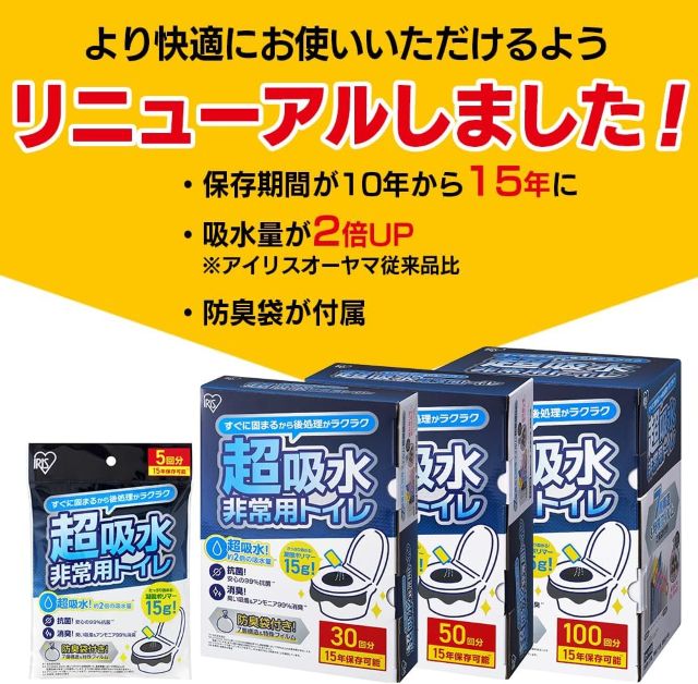 防災士監修のアイリスオーヤマ非常用トイレ100回分。15年保存と超吸収15グラムの凝固剤でニオイを徹底封鎖。防臭袋付きで災害時の衛生環境を死守する。家庭用備蓄の決定版として大切な家族の尊厳を守り抜く。
