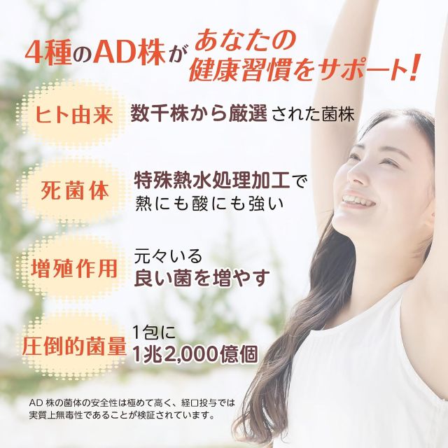 さらに、4種類のAD株乳酸菌を厳選して配合。腸の様々なエリアで働く多角的なアプローチにより、腸内フローラ全体のバランスを力強くサポートします。