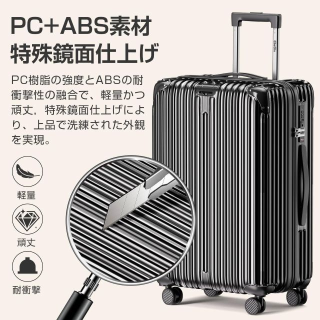 このスーツケースの最大の魅力は、その超軽量設計と、ABS+PC素材による高い耐衝撃性の両立にあります。旅先での荷物の移動は、想像以上に体力を消耗するものですが、この軽さがあれば、階段の上り下りや長距離の移動でも、驚くほど負担が軽減されます。