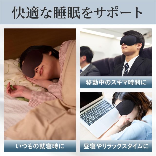 - 徹底した遮光性: 99.99%という高い遮光率は、明るい部屋や、飛行機・新幹線といった移動中の光からも、あなたの繊細な目を守り抜きます。この完全な暗闇が、脳を休息モードへと切り替え、効率的な疲労回復をサポートします。