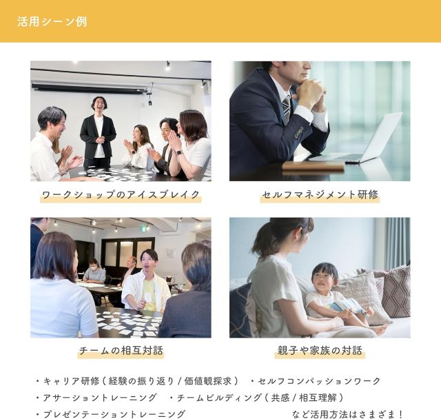 6歳から遊べるシンプルなルールでありながら、大人同士のチームビルディングや自己分析にも活用できる奥深さを持っています。難易度調整や、ポジティブなカードだけを使うといった使い分けも可能で、あらゆるシーンで「心の棚卸し」をサポートしてくれます。