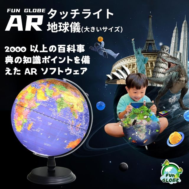最新のエイアール技術で立体的に学べるしゃべる地球儀は球径30センチの迫力サイズ。360度回転とライト付きでベッドサイドランプにもなる3ウェイ仕様。地勢タイプで防水性も備えた先生おすすめの新入学祝いに最適な知育玩具の決定版ギフト。