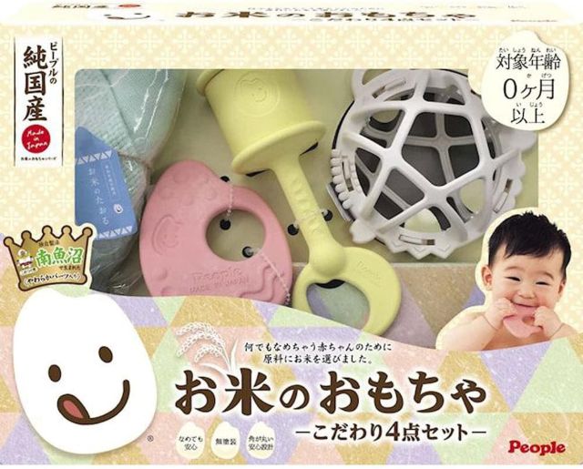 純国産お米の素材で安心。ピープルお米のおもちゃこだわり4点セットは、0歳からの歯がためや知育に最適。何でも舐める赤ちゃんを優しく見守る、出産祝いやギフトに選ばれ続けるロングセラーの逸品。